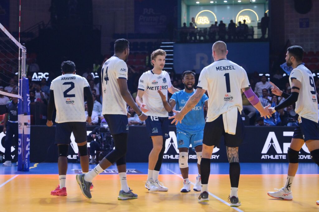 3 अक्टूबर, 2025: हैदराबाद के गाचीबोवली इंडोर स्टेडियम में जारी स्कैपिया द्वारा संचालित आरआर केबल प्राइम वॉलीबॉल लीग के चौथे सीज़न के दूसरे दिन बेंगलुरु टॉरपीडोज़ ने पिछड़ने के बाद वापसी करते हुए 15-9, 11-15, 13-15, 17-15, 15-9 से रोमांचक जीत हासिल की। जालेन पेनरोज़ को प्लेयर ऑफ़ द मैच चुना गया। भारतीय बैडमिंटन स्टार सात्विकसाईराज रंकीरेड्डी भी टॉरपीडोज़ का सपोर्ट करते हुए मौजूद थे।